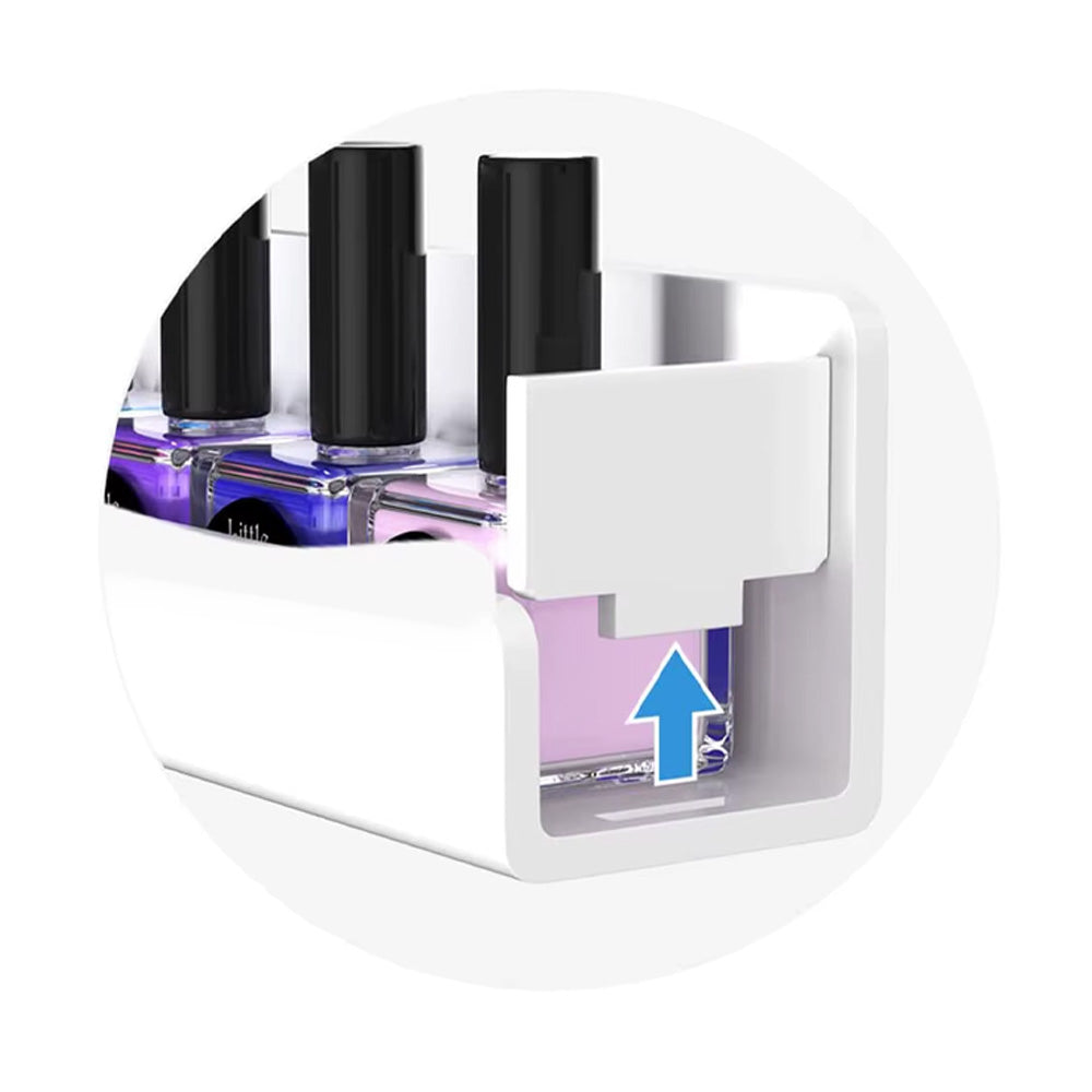 Grâce à leur structure en acrylique blanc et leur design incurvé, vos flacons sont parfaitement maintenus en place sans risque de chute. Faciles à fixer au mur, ces étagères vous permettent de gagner un espace précieux sur votre plan de travail tout en exposant vos plus belles teintes.