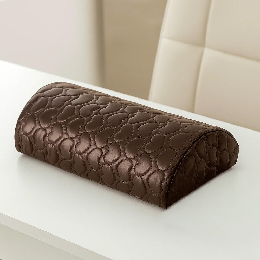 Ce coussin repose-main marron est l'accessoire indispensable pour toute prothésiste ongulaire. Grâce à sa mousse douce et son revêtement en simili cuir matelassé à motifs cœur, il combine confort, praticité et esthétique.