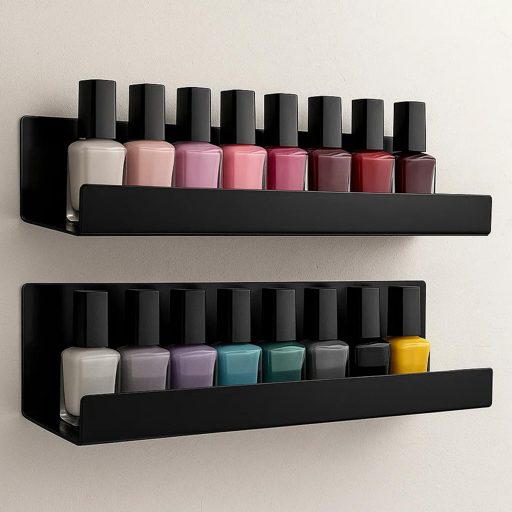 Apportez une touche moderne et fonctionnelle à votre espace de travail avec ce lot de 2 étagères murales noires brillantes. Conçues en acrylique résistant, elles mesurent 35 cm de long et 6 cm de haut et de profondeur, offrant un espace optimal pour ranger ou exposer vos flacons de vernis.