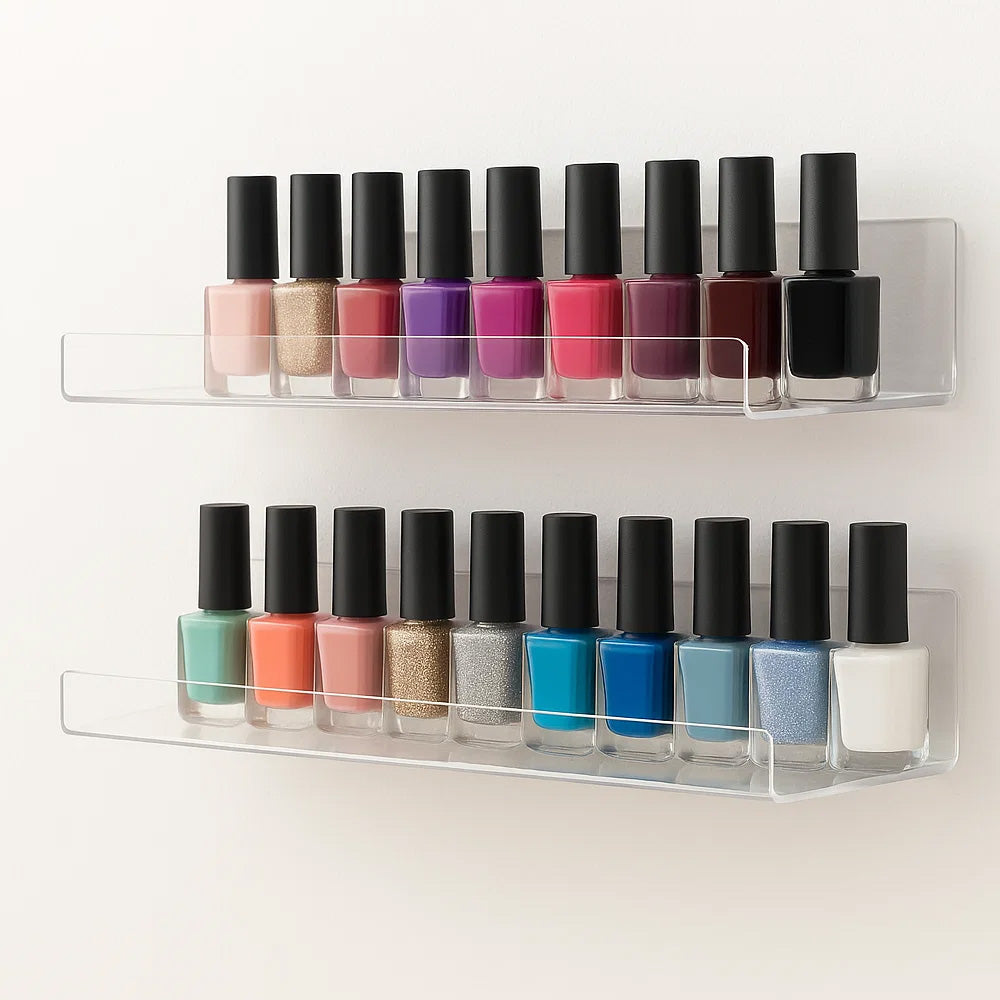 Ce lot de deux étagères murales transparentes est parfait pour sublimer votre espace beauté. Fabriquées en acrylique de qualité, elles permettent d’organiser vos flacons de vernis ou accessoires nail art tout en gardant un espace propre et esthétique.
