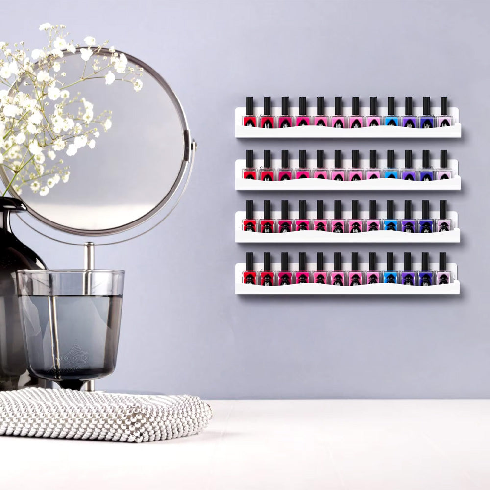 Grâce à leur structure en acrylique blanc et leur design incurvé, vos flacons sont parfaitement maintenus en place sans risque de chute. Faciles à fixer au mur, ces étagères vous permettent de gagner un espace précieux sur votre plan de travail tout en exposant vos plus belles teintes.